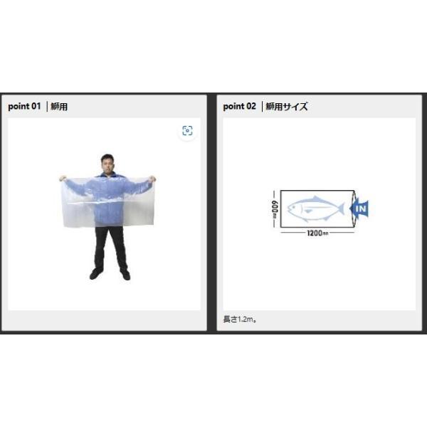 厚さ0.15mmの極厚大物ポリ袋 厚さ0.15mmの極厚ポリ袋。一般的な厚手ゴミ袋が約0.04mm程度にたいして、本品は厚さ0.15mmの極厚手。丈夫で鰤や鮪の収納に安心。鰤用は長さ1.2m、鮪用は長さ2.4mと大物もスッポリ入るロングサイズ。クーラーやフィッシュキャリーのインナーバッグとしても最適。規格:鰤用 サイズ(mm):厚さ0.15×幅600×長さ1200 接続部素材:ポリエチレン 。