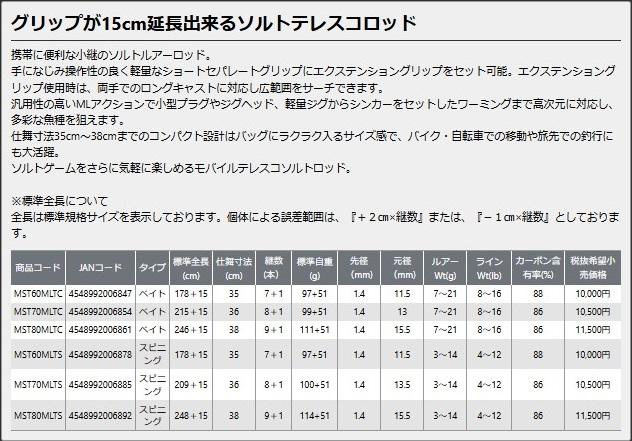 ベイトリール仕様ですグリップが15cm延長出来るソルトテレスコロッド携帯に便利な小継のソルトルアーロッド。手になじみ操作性の良く軽量なショートセパレートグリップにエクステンショングリップをセット可能。エクステンショングリップ使用時は、両手でのロングキャストに対応し広範囲をサーチできます。汎用性の高いMLアクションで小型プラグやジグヘッド、軽量ジグからシンカーをセットしたワーミングまで高次元に対応し、多彩な魚種を狙えます。仕舞寸法35cm~38cmまでのコンパクト設計はバッグにラクラク入るサイズ感で、バイク・自転車での移動や旅先での釣行にも大活躍。ソルトゲームをさらに気軽に楽しめるモバイルテレスコソルトロッド。