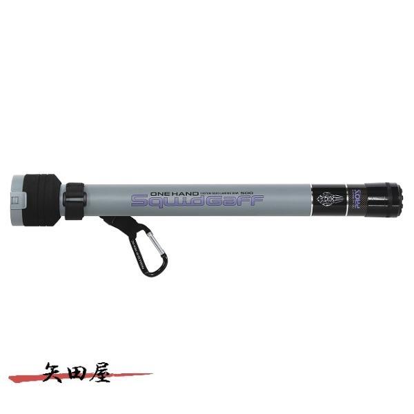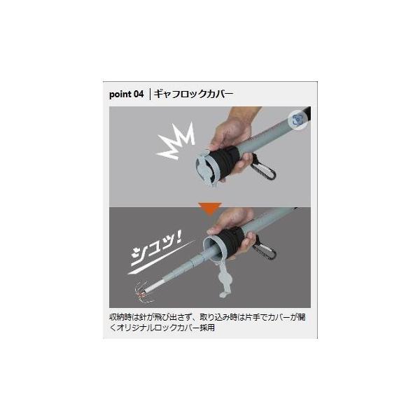 片手で素早いランディング!アオリイカ専用ギャフ ワンハンドでアオリイカを取り込むランディングギャフ。収納時はギャフが飛び出さないギャフロックカバーが付いたセーフティー機構。取り込み時には片手でカバーを開き素早いランディングが可能。 穂先は視認性に優れたホワイト塗装。 ギャフはイカを掛けやすい6本針。 機動性にも優れた小継仕舞39cm。着脱式カラビナが付属し、携行性抜群。ランガンエギングの必須アイテム。メーカー保証書付属グラス100%仕舞寸法:45.5cm全長:500cm継数(本):15標準自重(g):630先径(mm):7.5元径(mm):38針数(本):6ギャフ直径(mm):44