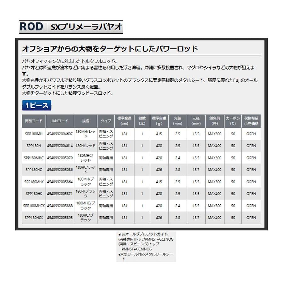 商品コード:SPP180HCK●規格:180HC/ブラックタイプ:両軸専用●標準全長(cm):181継数(本):1●標準自重(g):426先径(mm):2.8●元径(mm):15.7錘負荷(号):MAX300●カーボン(%):50【免責事項】※メーカーのリニューアルに伴い仕様・カラー等が予告無く変更になる場合がございます。新パッケージでお届け致します事ご了承願います。