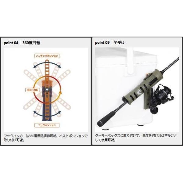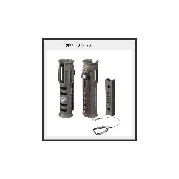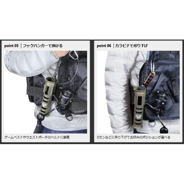 マルチユースなロッドホルスター 様々な場所に取り付けて使えるロッドホルスター。ベルト固定式に比べて着脱が簡単で、ゲームベストやウエストポーチのベルト、Dカンなど、様々な位置への取り付けが可能。リールの向きを3方から選べ、タックルの角度調節によって、お好みのポジションで手返しがスムーズ。タックルの脱落を防ぐ回転式ロックキャップと、本体の落下防止ワイヤー付。付属のスリーブをクーラーボックスなどの側面に取り付けて、移動時の持ち運びや角度を付けて竿受けにしたり、スリーブから抜いて腰ベルトに差したりできるマルチユースなアイテム。全長(mm):190最大対応ロッド径(mm)37.5最大対応リールフット幅(mm):16.5付属ワイヤー長(mm):200