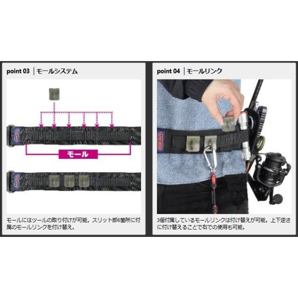 ウエスト調整は紐を引くだけ!自由度の高いフィッシングベルト 胴回りの調節が素早く行えるクイックアジャストタイプのバックルを採用。ベルト幅50mm対応のタックルバッグやロッドホルスターなどが取り付け可能。ベルトの端を留められるベルトカン付き。多目的なモールシステム搭載で、カラビナが簡単に取り付けられるモールリンク3個付き。ラインカッターやフックリムーバー、プライヤー、フィッシュキャッチャーなど、使用頻度の高いツールが携帯可能。ライトゲームやトラウト、ランガンスタイルに最適なフィッシングベルト。●カラー:ブラック●コード長(m):2.2●ベルト幅(mm):50●最大周長(cm):130