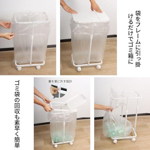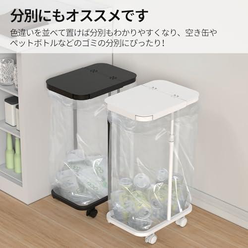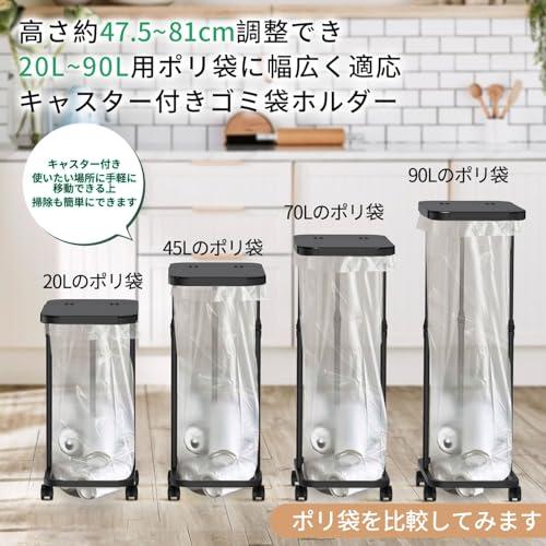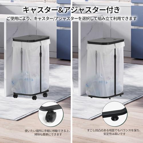 【20L~90L用ポリ袋に幅広く適応】??本ゴミ袋ホルダーの高さは約47.5--81cm調整できており、高さの調整だけで20L、30L、45L、70L、90L用ポリ袋などに幅広く適応する上、スペースを取らないことも保証されます。ゴミをよりいっぱい入れることができますので、ゴミ捨ての日までに何度も袋を替える必要がない上、一人暮らしはもちろん、家庭用ゴミ箱としても最適です。??また、ゴミ袋をフレームに引っかけて簡易的にゴミ箱として使用できる上、ゴミがパンパンに溜まっても、大きく開いた側面からゴミ袋を取り出せるのでゴミ出しも容易にできます。 【キャスター&アジャスター付き】??ご使用により、キャスター/アジャスターを選択して組み立て利用できるゴミ袋 スタンドです。キャスターを選択する場合、サッと移動しやすいので使い勝手がよく、普段の掃除が楽になります。??またストッパーつきキャスターですので固定もできて便利です。アジャスターを選択する場合、すこし凹凸のある地面でもバランスを保ち、安定性は高いです。 ??注:より移動しやすいを確認するために、キャスターは2pcs(ストッパー付)+2pcs(ストッパー無)です。 【あらゆる場所で大活躍&ニオイ漏れ対策】??シンプルな蓋付きゴミ箱ですっきりとしたデザインで、インテリアに馴染みやすくて、キッチン、台所、リビング、洗面所、オフィスなどあらゆる場所で大活躍しております。??また、ニオイ漏れをおさえるフタ付きゴミ袋ホルダーである上、蓋には固定用テープと騒音防止用テープも付いており、ゴミ袋はよりしっかり国定でき、滑り落ちることを心配する必要がなくて、ゴミの匂いもしっかり閉じ込め、空気を綺麗にして、蓋の閉める音も小さくなり、より楽に使用可能な塵袋ホルダーです。 【分別にもオススメ&商品仕様】??ゴミ袋スタンドには2色あり(ブラックとホワイト)、色違いを並べて置けば分別もわかりやすくなり、プラごみ、ビン、紙類、空き缶やペットボトルなどのゴミの分別にぴったりです。分別ゴミ箱として適しております。??【商品仕様】アジャスタータイプ組立後サイズ:約33.5*22.5*47.5~78cm キャスタータイプ組立後サイズ:約33.5*22.5*50.5~81cm 【組立簡単&安心の12ヶ月品質保証】??日本語の取扱説明書が付いており、説明書の手順によって、迷いなく簡単組立可能の分別ゴミ袋ホルダーです。??また、弊社から購入されました商品は12ヶ月の保証期間をご提供しておりますから、何らか不明や状況があれば、ご注文番号をご用意の上、ご連絡いただけましたら、各種サポートを速やかに提供させていただきます。