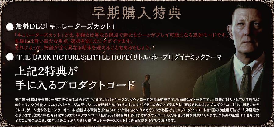 ・無料DLC「キュレーターズカット」 ・「THE DARK PICTURES:LITTLE HOPE(リトル・ホープ)」ダイナミックテーマ 上記2特典が手に入るプロダクトコード