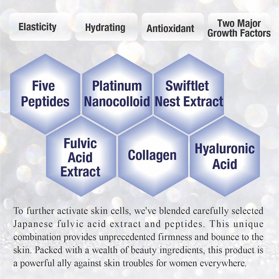 プラチムモイストは従来の保湿クリームという役割だけでなく、2大成長因子「EGF」「FGF」を始め、「プラセンタエキス」、古くから“美”の高級食材とされてきた「ツバメの巣エキス」、その他ヒアルロン酸、コラーゲン、アルジルリンなど、美の集大成とも言える高価な成分をふんだんに配合し、単にお肌の潤いを守るだけでなく、内側からハリと弾力を引き出し、目覚めの肌に自信が持てます。