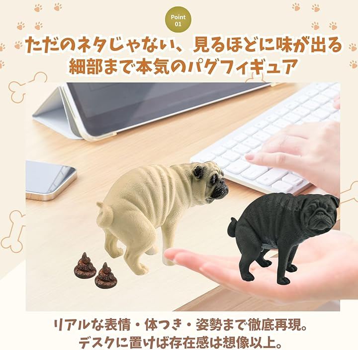 パグの表情や体つきは細部までリアルに作り込まれており、ただのネタグッズでは終わらない完成度のフィギュア。