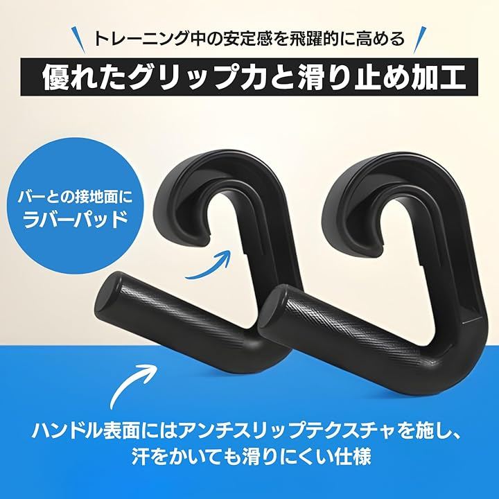 さらにバーとの接地面にはラバーパッドを備え、トレーニング中の安定感を飛躍的に高めます 。