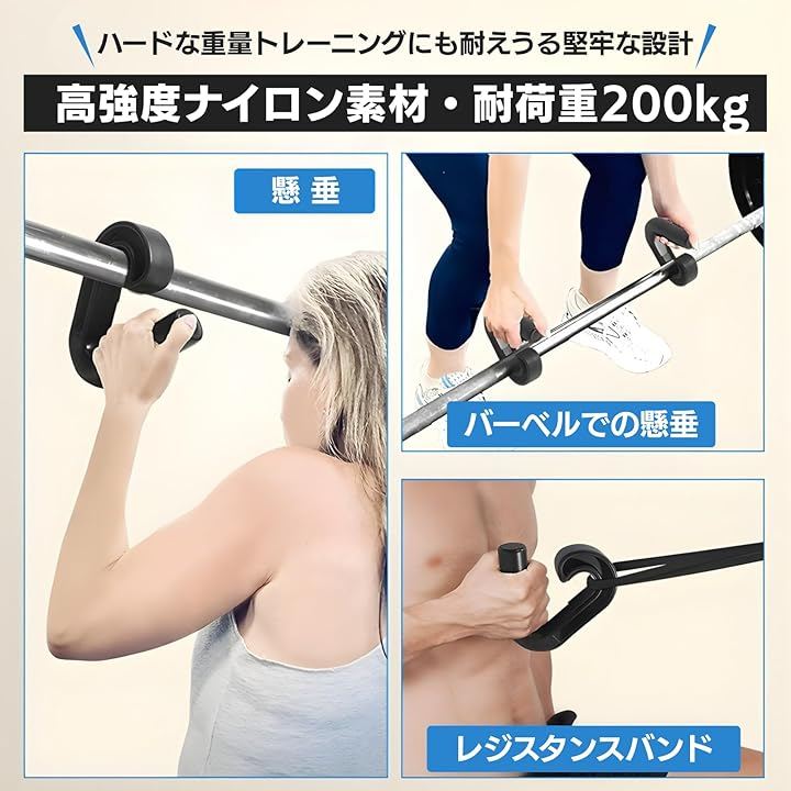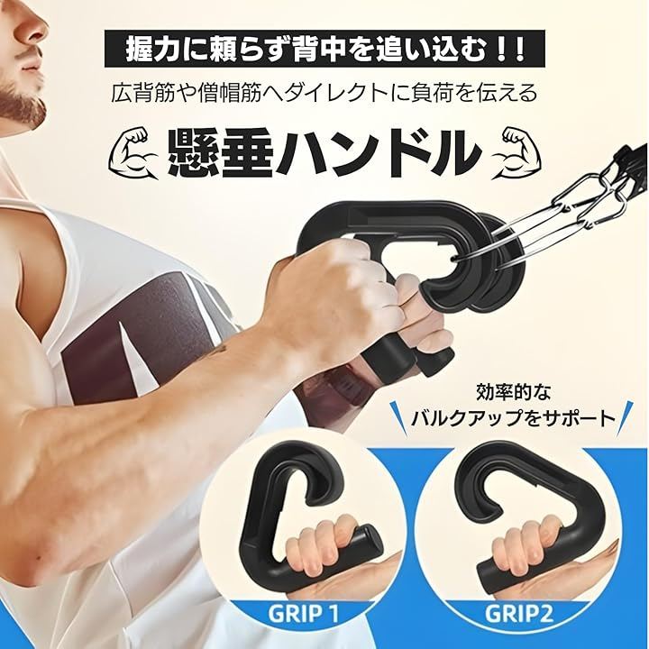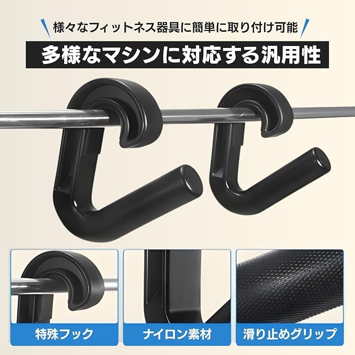 「多様なマシンに対応する汎用性」 懸垂バーはもちろん、ラットプルダウン、ケーブルマシン、バーベルなど、様々なフィットネス器具に簡単に取り付け可能 。