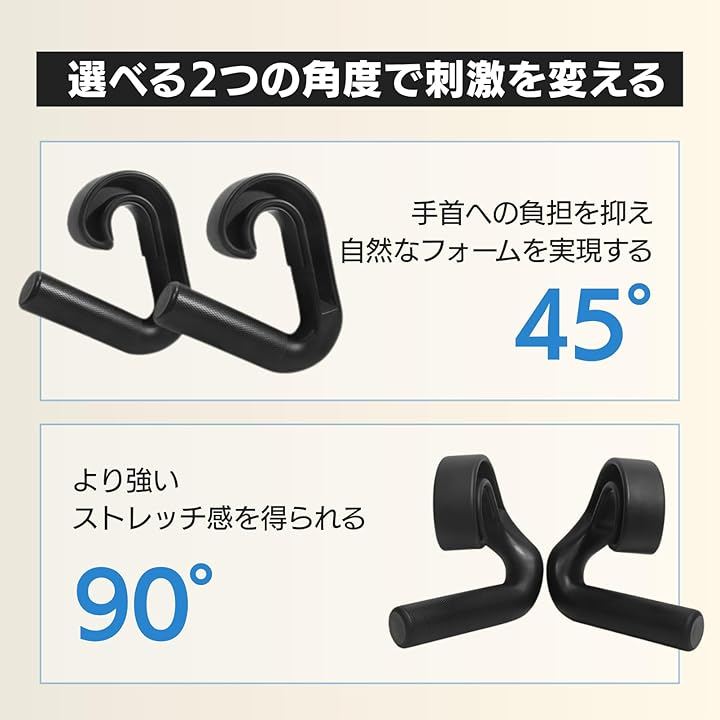 「選べる2つの角度で刺激を変える」 手首への負担を抑え自然なフォームを実現する「45°」と、より強いストレッチ感を得られる「90°」の2種類を用意。