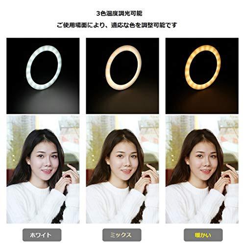 【高い演色性、美顔効果が抜群】リングライトは18pcs省エネLEDビーズで作製されます。高い演色性で、紫外線や赤外光の照射なし、柔らかく均一な光を生成し目に優しいです。美顔効果が抜群でビデオや写真をもっと綺麗になります。美肌柔肌に撮れるだけでなく、瞳に円形アイライトを作って綺麗に見えます。熱放散が優れている、定電流駆動ので使いやすい寿命が長くなります【3色,無段階調光】3色の照明モード及び明るさが調整可能です。無段階光量調整の機能が付いていますので自由にLEDの明るさを選択できます。白色/暖色/ミックス3色はさまざまな場面であなたの美しさを照らします。【USBポート】USBポートは、コンピュータホスト、ラップトップ、モバイル電源、USB充電器などの様々なデバイスと接続して使用できます。屋外や屋内を問わず、小さいサイズでお使う場所を選ばない。いつでもどこでも無料でLEDリングライトを楽しむことができます。【取付け簡単】LEDリングライトはホルダーに取り付けることができ、どこでもそれを取ることができます。またいつでもスタンドから取り外すことができます、三脚ボールヘッドは360度回転させて自由に角度を調節できます(ホルダーは含まれません)【携帯型、広範囲の適用性】軽量で携帯可能なデザイン:旅行、作業するときに使用便利です。広範囲の適用性: Youtubeビデオ、自撮り写真、美容化粧、生放送、ポートレート、Facebook、Twitter、広告写真、ビデオ撮影などに広く適用されています。