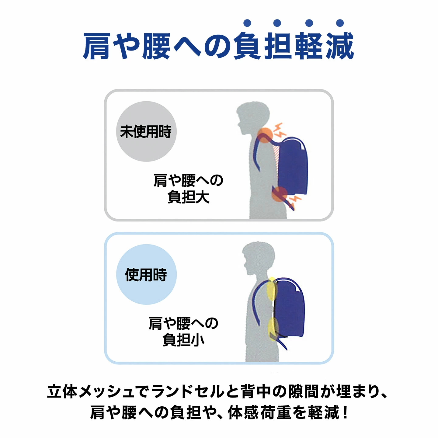 【ランドセル用背当てパッド】快適な通学をサポートするアイテム、蒸れない&疲れにくい、ランドセル用背当てパッド。メッシュ素材を使用した立体構造により、空気が通りやすく、蒸れにくい設計が特徴です。また、肩や腰への負担を軽減するため、長時間の使用でも疲れにくく快適な背負い心地を提供します。毎日の通学をより快適にするオススメアイテムです♪ 手洗い可能。
