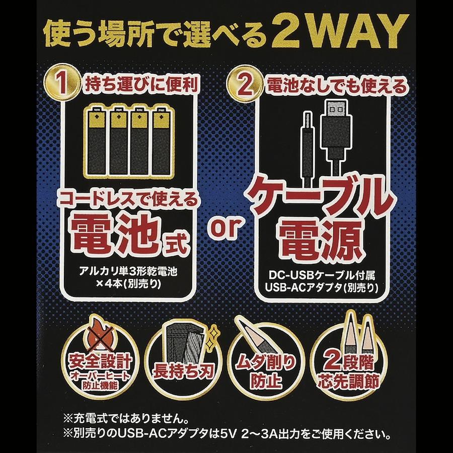 USB給電と電池の2WAYで使用可能安全設計(オーバーヒート防止装置付・ムダ削り防止機能付)3種類の鉛筆対応(三角軸、六角軸、丸軸)2段階の芯先調節機能付