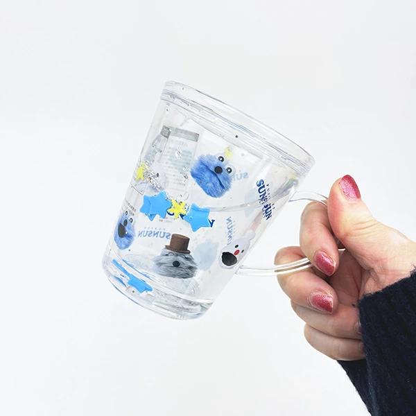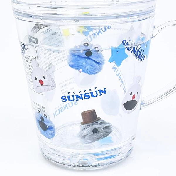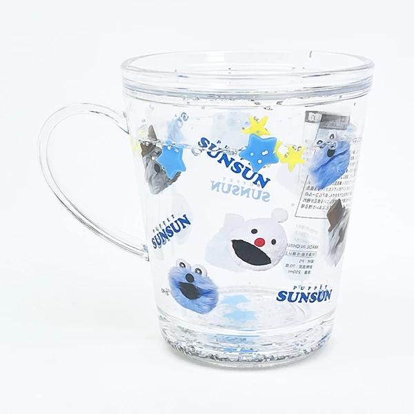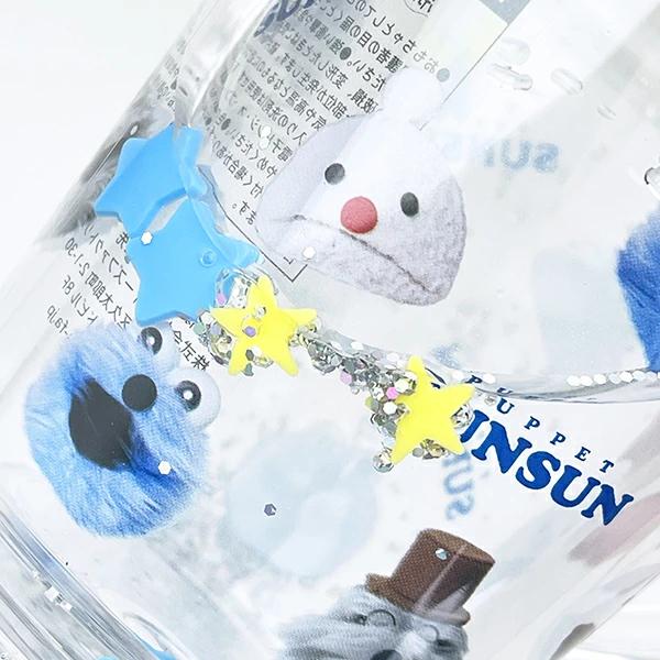 パペットスンスンのウォーターカップです。コップを使うたびに星やラメがぷかぷか揺れて可愛い♪しっかりしているコップなのでお子様でも安心してお使いいただけます☆スンスン好きの方はぜひGETして食卓やリラックスタイムなどのお供にいかがですか?