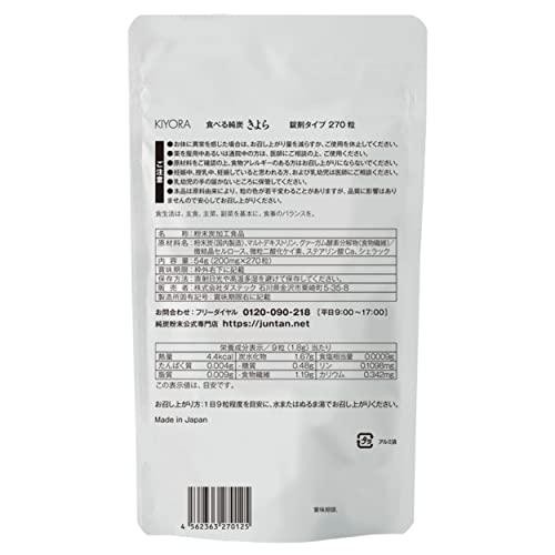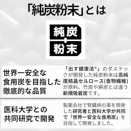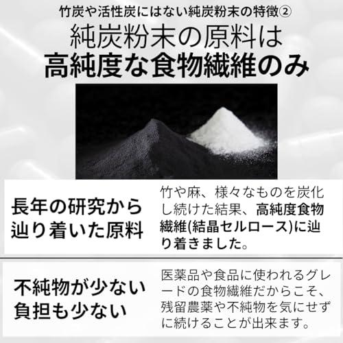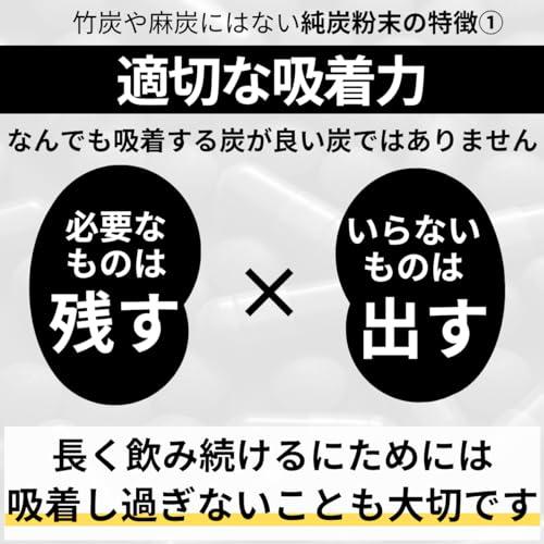 規格・内容量:54g(200mg×270粒) 1日目安量当たりの純炭粉末量:約560mg 原材料・成分:粉末炭、デキストリン、グヮ-ガム酵素分解物(食物繊維)、結晶セルロース、微粒二酸化ケイ素、ステアリン酸Ca、シェラック 【純炭粉末】吸着力と安全性を兼ね備えた長期使用を前提として医科大で開発された新規素材です。竹炭や木炭とは違うものです。 【不純物のない炭】原料は木や竹ではなく「食物繊維のみ」を炭にすることで他とは全く違う炭の純度・綺麗さを実現しました。 【腎臓と身体に負担をかけない】腎臓への負担となるリンやカリウムは竹炭の1/1000。さらに他の炭と違い消化酵素も吸着しないので消化不良も起こしません。 【小さく飲みやすい形状】錠剤タイプは粒が小さいことが特徴。?み砕くこともできます。飲みやすいとのお声を頂いています。 【結果は数値に表れます】お客様の多くは、数値を記録することで実感して頂いています。 【安心・安全へのとりくみ】純炭粉末は国内・石川県の自社工場にて製造しています。また全ロット試験を実施。GMP認定工場にて錠剤状に加工しています。