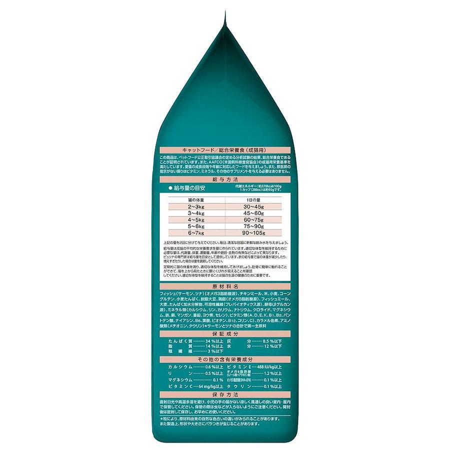 新鮮なサーモン&ツナを贅沢に使用した抜群の美味しさ。消化に優れた原材料を使用し、プレバイオティクスでお腹の健康ケア。pHコントロールで尿路の健康ケア。●抜群の美味しさー新鮮なサーモン&ツナをを贅沢に使用 ●お腹の健康ケアー消化に優れた原材料を使用し、プレバイオティクスでお腹の健康をケア ●尿路の健康ケアーミネラルバランスの調整によるpHコントロールで尿路の健康ケア3つの栄養素の特別な配合で健康を保ち、体の内と外の両面から免疫力を維持します。原材料:フィッシュ(サーモン、ツナ)(オメガ3脂肪酸源)、チキンミール、米、小麦、コーングルテン、小麦たんぱく、脱脂大豆、鶏脂(オメガ6脂肪酸源)、フィッシュミール、大麦、たんぱく加水分解物、可溶性繊維(プレバイオティクス源)、酵母(βグルカン源)、ミネラル類(カルシウム、リン、カリウム、ナトリウム、クロライド、マグネシウム、鉄、銅、マンガン、亜鉛、ヨウ素、セレン)、ビタミン類(A、D、E、K、B1、B2、パントテン酸、ナイアシン、B6、葉酸、ビオチン、B12、コリン、C)、カラメル色素、アミノ酸類(メチオニン、タウリン)保証成分:たんぱく質:34%以上、脂質:14%以上、粗繊維:3%以下、灰分8.5%以下、水分12%以下