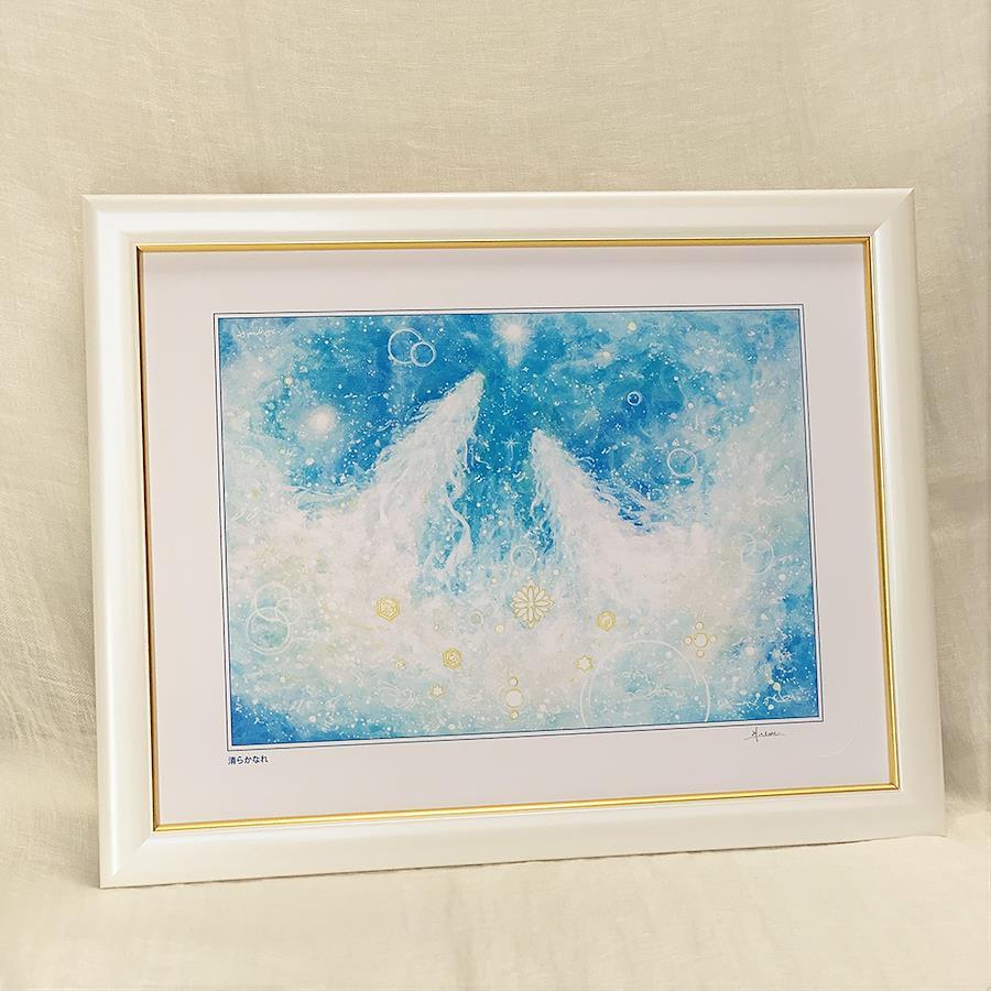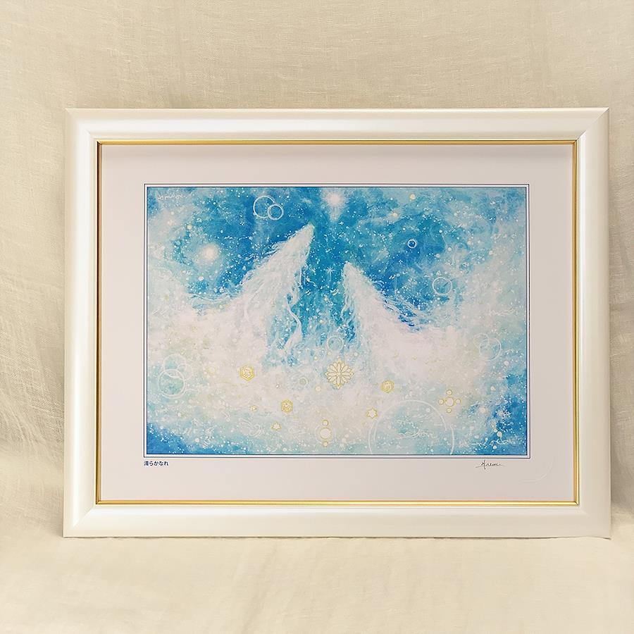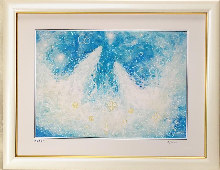 *HYMジクレーについてジクレーとは、フランス語で吹き付けるという意味があります。通常、デジタル化したものを色修正せず、印刷した場合、ほぼ間違いなく原画とは程遠いものになってしまいます。HYMジクレーでは、グラフィックデザイナーでもあるHIDEKIのパートナーであるYUMICOが、HIDEKI監修のもと、デジタル化した原画を、原画のエネルギーを損なわないように、印刷に適した色合いを再構成して完成させた、もう一つの原画といえるものです。印刷された、作品には、HYMのエンブレムをエンボス加工し、HIDEKIのサインをお入れしております。