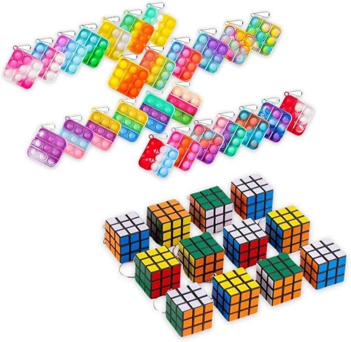 「2種類の人気アイテムをまとめたお得な大容量セット」 脳トレや知育に役立つ立体パズルのミニキューブキーホルダー12個と気分転換に最適なバブルキーホルダー24個を組み合わせた合計36個入りの大容量セットです。