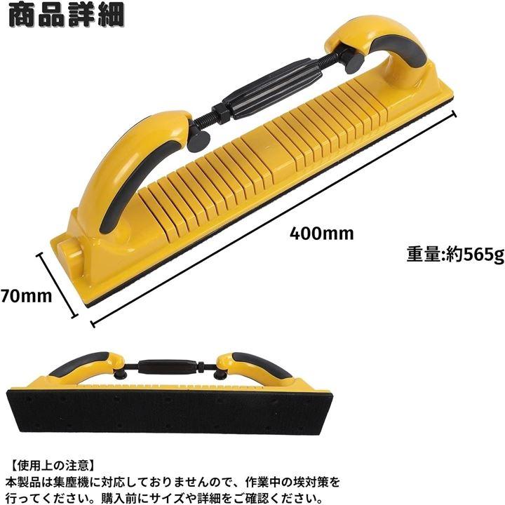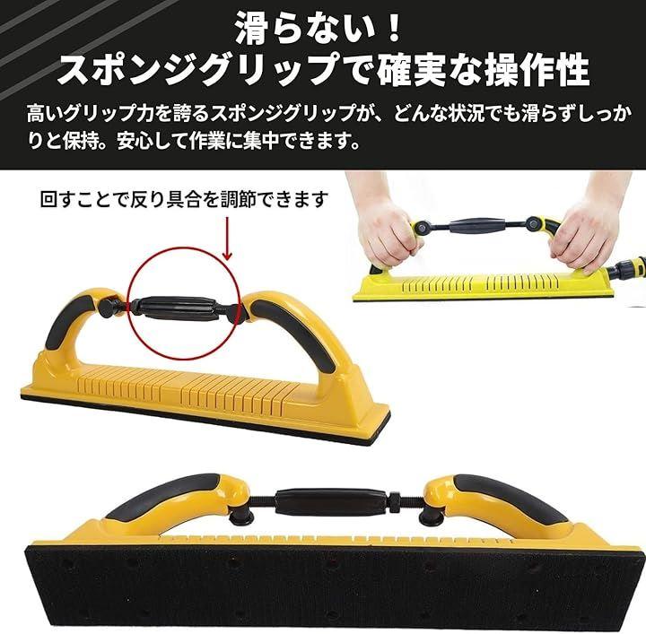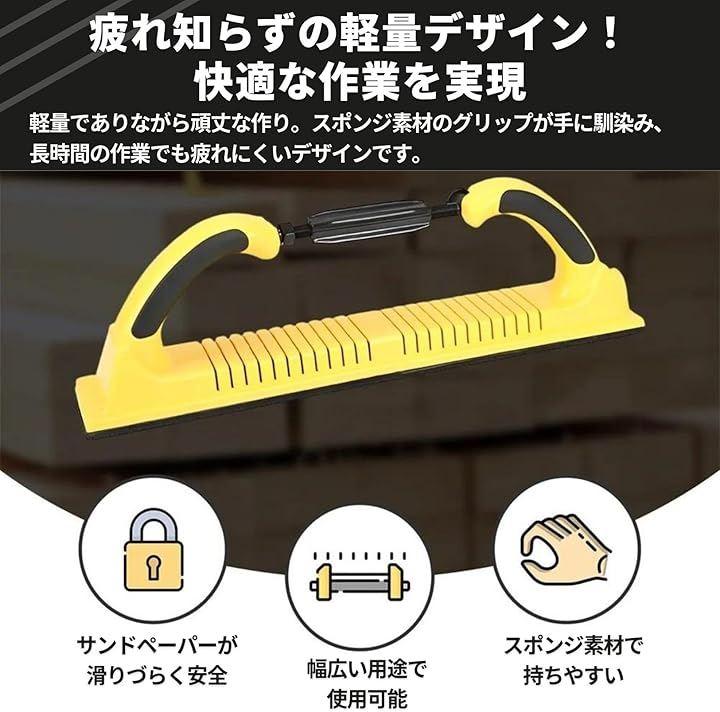 面ファスナー式のサンドペーパーに適合し、グリップ部分はスポンジ素材で軽量かつ高いグリップ力を持つため、長時間の作業でも疲れにくいです。
