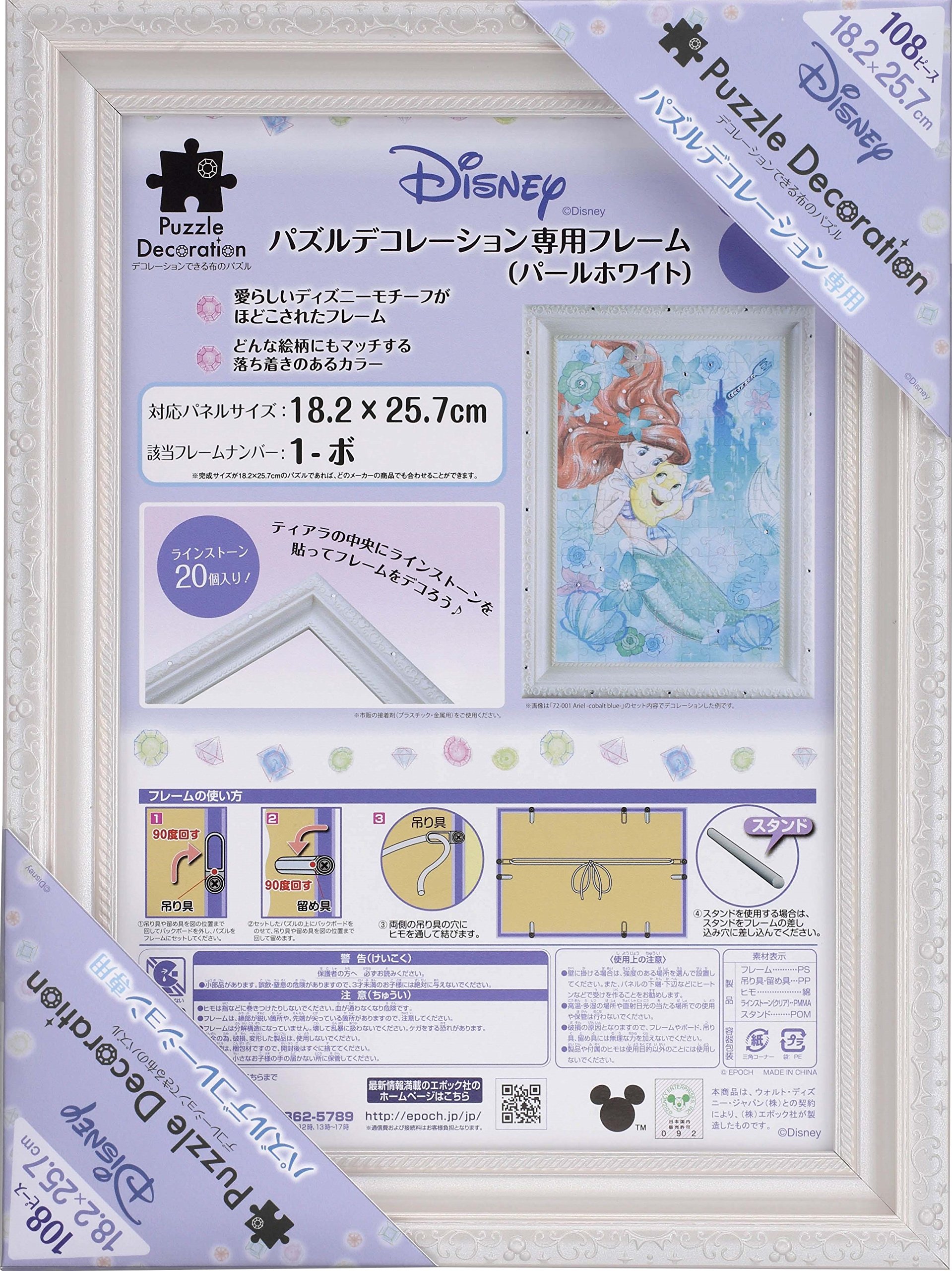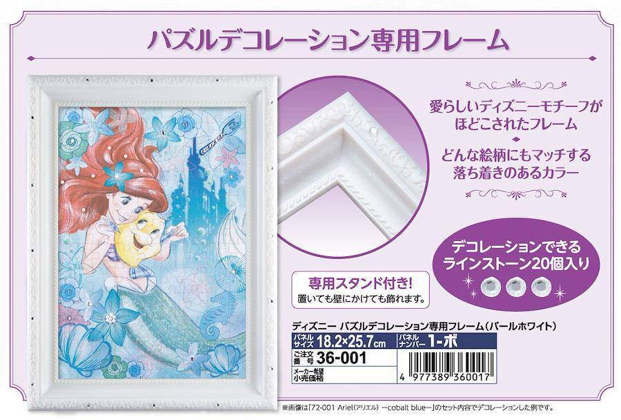 ディズニー パズルデコレーション専用フレーム! 可愛らしいディズニーのモチーフが模様に施されています。フレームをデコレーションできるラインストーン20個入り! 色はどんな絵柄にも合うパールホワイトで作品を魅力的に引き立てます。立てて飾れるスタンドが付属しています。紙製ジグソーパズルにも対応しています。※透明カバーは付属していません。