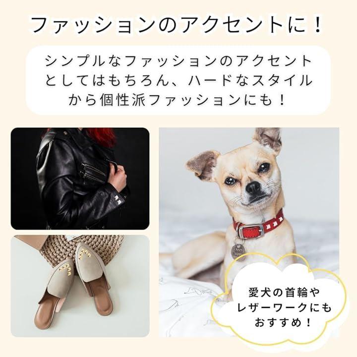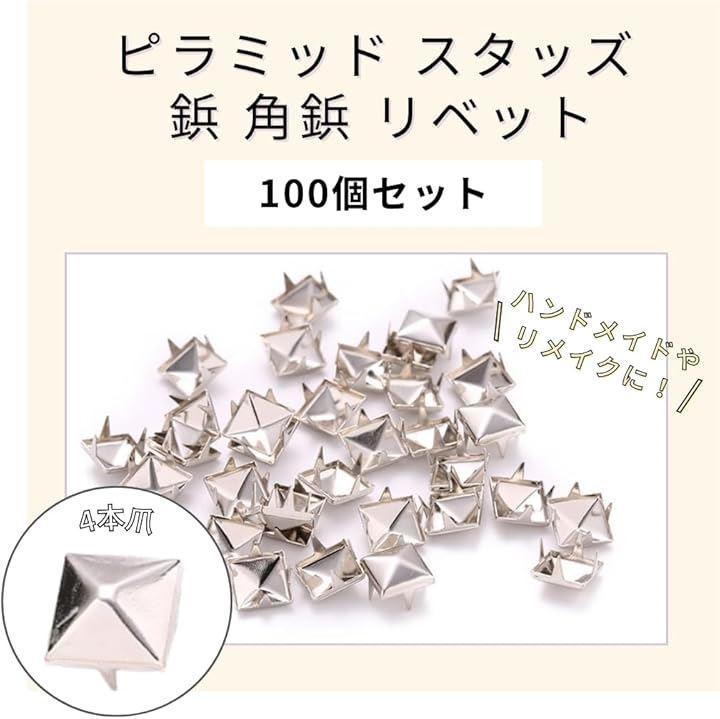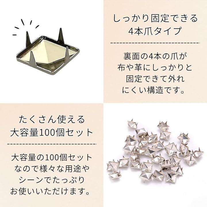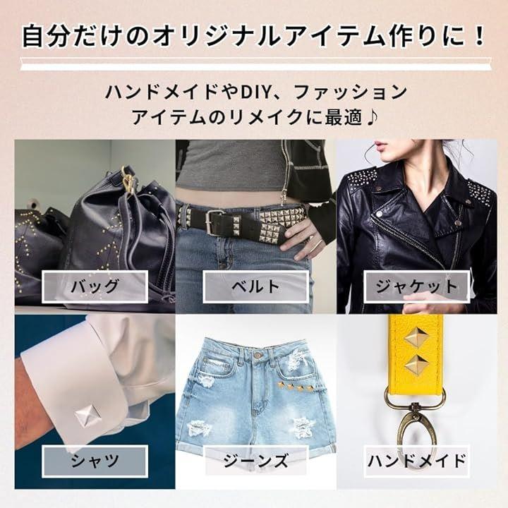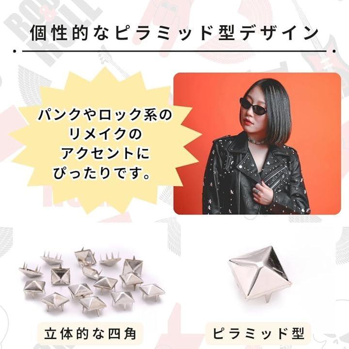 個性的なピラミッド型デザイン:四角の立体的な形状が特徴のピラミッド型スタッズで、パンクやロック系のリメイクのアクセントにぴったりです。