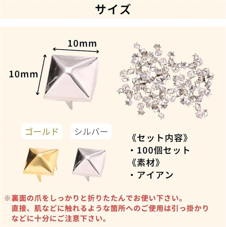 《サイズ》10x10mm 《セット内容》100個セット 《素材》アイアン 《カラー》ゴールド・シルバー *裏面の爪をしっかりと折りたたんでお使い下さい。