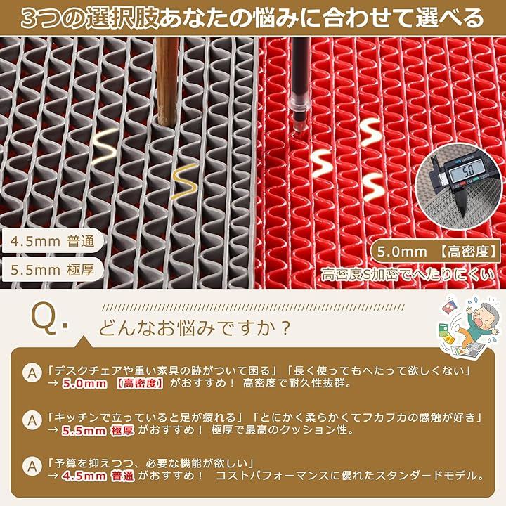 「商品詳細」 厚さ:4.5mm/5.5mm サイズ:幅0.9m x 長さ1m / 3m / 5m / 10m / 15m(自由に選択可能) 材質:環境に優しいPVC(ポリ塩化ビニル)、安全無毒 特長:高耐久・耐磨耗・耐水性・難燃性・防音性 変形しにくく、繰り返し使用可能な滑り止めマット