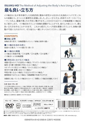 イスに座って立つだけ! “ウソみたいな”本当に効く体軸調整! <イス軸法のメリット> 1.身体能力の向上 2.骨盤の歪みの修正 3.バランスの良い身体作り 最も良い立ち方がカラダを変える! イス軸法は、私が長年修行した伝統武術と整体の研究から生まれた私独自メソッドです。これらの経験から、立つことの重要性を認識しました。正しい立ち方は、武術やスポーツのパフォーマンス向上、腰痛や肩こりの予防に繋がります。このDVDでは【クイック体軸調整イス軸法】をご紹介します。 イス軸法を行うことで体軸を調整することができ、皆さんの体にとって、最も良い立ち方を作ることができます。 これから紹介していく内容を順番に行うことで、体軸の調整が可能になりますので、 ぜひ皆さん一緒にやってみてください。(西山創) Contents ●体軸と姿勢 体軸を取り戻す/体軸調整のメリット/体軸と体幹の違い ●イス軸法を始める前に 服装の注意点/イスの選び方・使い方 ● イス軸法の実践 イス軸法の実践手順/①の姿勢/②の姿勢/③の姿勢/ イス軸法による体軸調整 ●日常生活におけるイス軸法 骨盤の歪みのケアが出来るイス軸法/デスクワークが楽になるイス軸法/ 猫背・反り腰・O脚X脚の予防になるイス軸法/ ヨガ・ダンスに役立つイス軸法/ゴルフに役立つイス軸法/ 育児や介護・家事に役立つイス軸法/ 呼吸が楽になるイス軸法/片足立ちで行うイス軸法/ 膝関節症でも行えるイス軸法/体軸調整が失敗するやり方 体験前に抱いていたイス軸法のイメージ/実際にイス軸法を体験してみて 指導・監修◎西山創(イス軸法開発者) 1976年岡山県岡山市生まれ。イス軸法?? 開発者。中学・高校と柔道部に所属。岡山太極拳会代表。意拳、太極拳など中国伝統武術を学ぶ。34歳で岡山県にて整体院・太極拳教室を開業し、全国で整体スクールの講師を務める。42歳で身体に優しい回復法を研究する会を立ち上げる。43歳でイス軸法の普及活動を開始し、全国各地でセミナーを開催。 撮影協力◎浜崎芳忠・盛智恵・万代千明・畠山烈