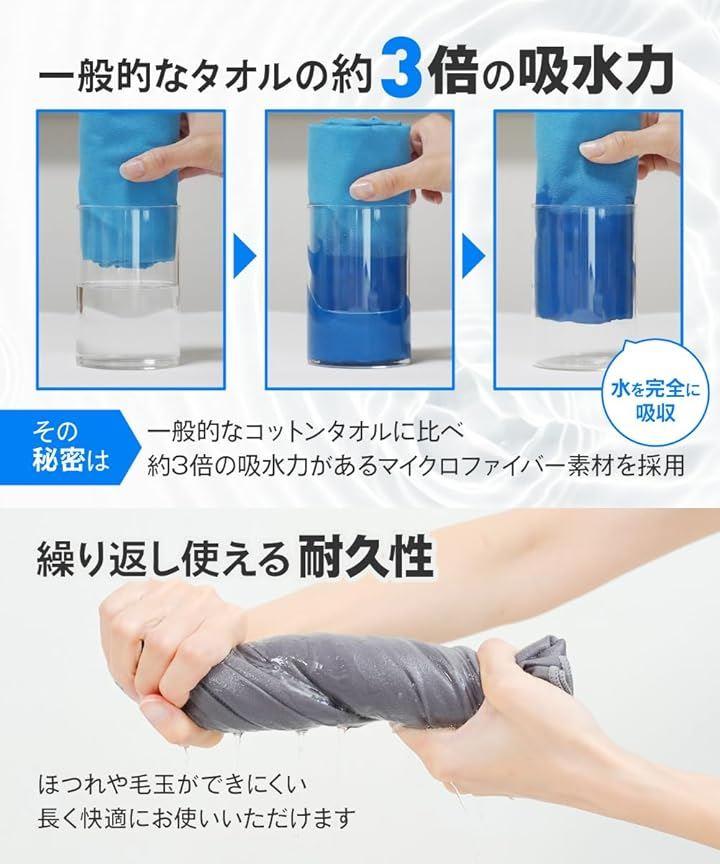「一般的なタオルの約3倍の吸水力」 一般的なコットンタオルに比べ約3倍の吸水力があるマイクロファイバー素材を使用。