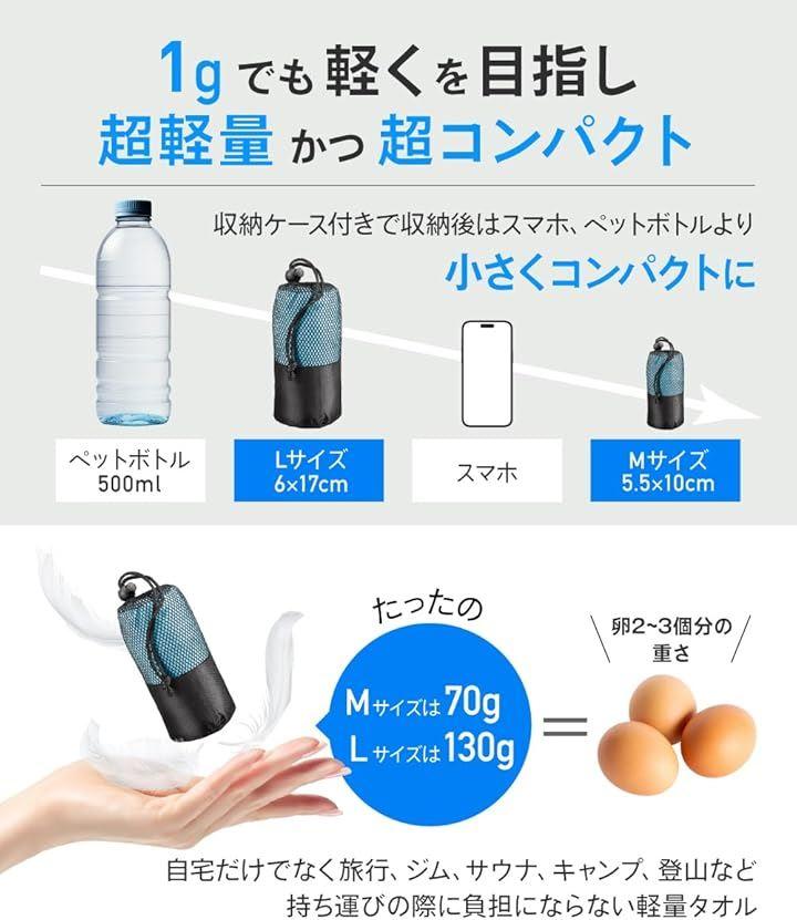 「1gでも軽く超軽量かつ超コンパクト」 Mサイズは約70g、Lサイズは約130gと卵2~3個分の重さ自宅だけでなく、旅行、ジム、サウナ、キャンプ、登山など持ち運びに負担にならない軽量タオルを実現しました。