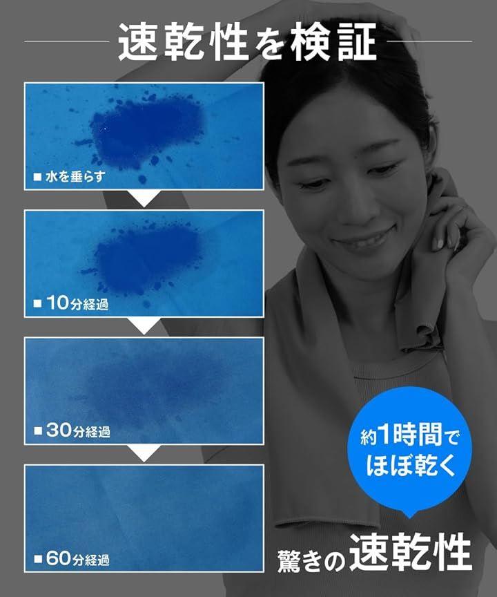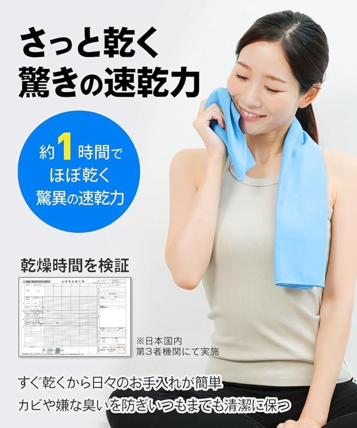 「さっと乾く 驚きの速乾性」 通気性が高くすぐに乾くスポーツタオル。