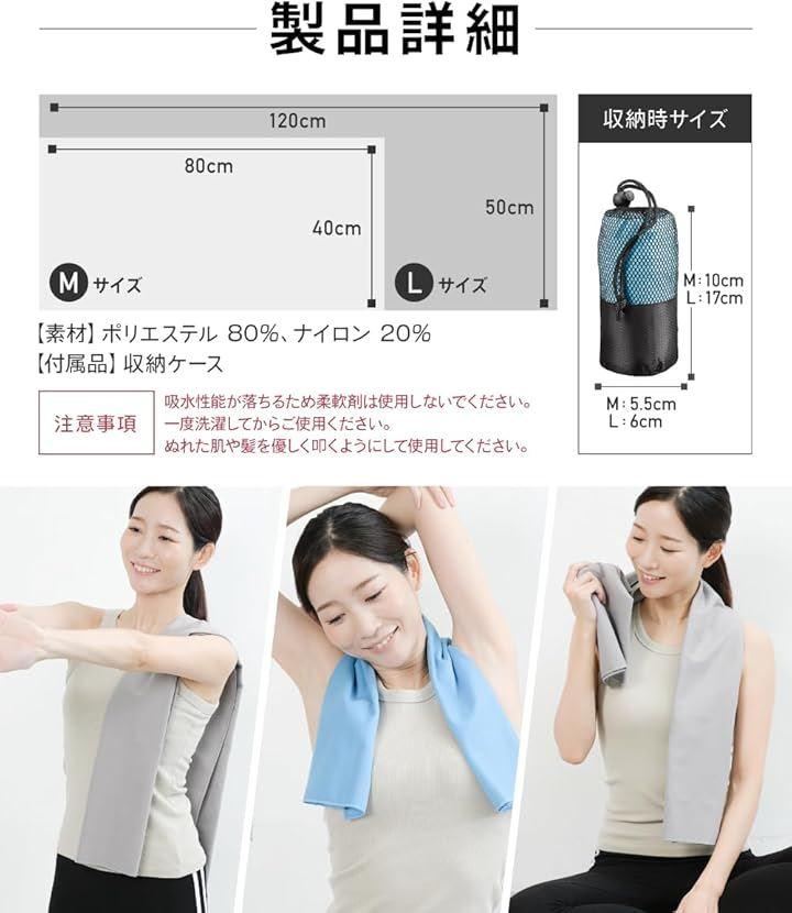 「使いやすさにこだわったサイズ」 Mサイズは40x80cmのフェイスタオルとして、Lサイズ 50x120cmのミニバスタオルとしてご使用いただけます。