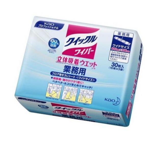 製品の特徴●花王プロフェッショナル Quickle クイックルワイパー ワイド 立体吸着ウエットシート 業務用●フロア用そうじシート●クイックルワイパーワイド業務用専用の立体吸着ウエットシート。●ベタベタ汚れのリセット清掃に!洗浄液を含んだ立体構造のシートで、ホコリ・髪の毛から皮脂・泥・食べこぼしまで1度に拭き取れます。●使い捨てのシートなので、汚れや菌を塗り広げることなく衛生的。●シートは両面使えるワイドサイズ(約50cm)で、広いスペースもラクラク清掃できます。●99%除菌(*)&消臭。香りが残らないタイプ。[*すべての菌を除菌するわけではありません。]●品名:掃除用シート●用途:床(フローリング、ビニール)・壁・網戸●液性:弱アルカリ性●大きさ:約540mm×約205mm