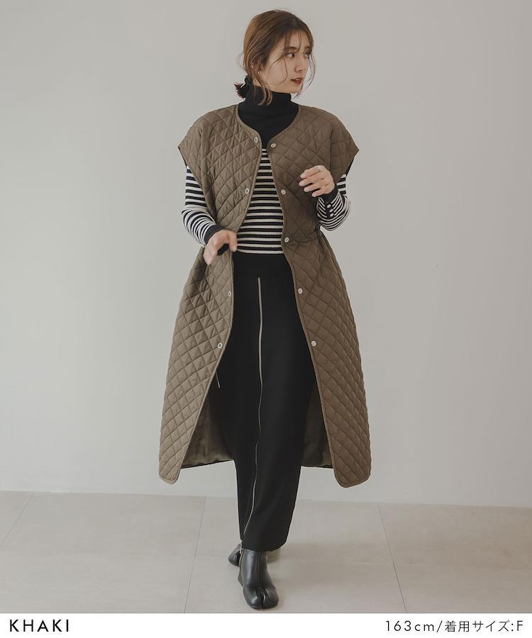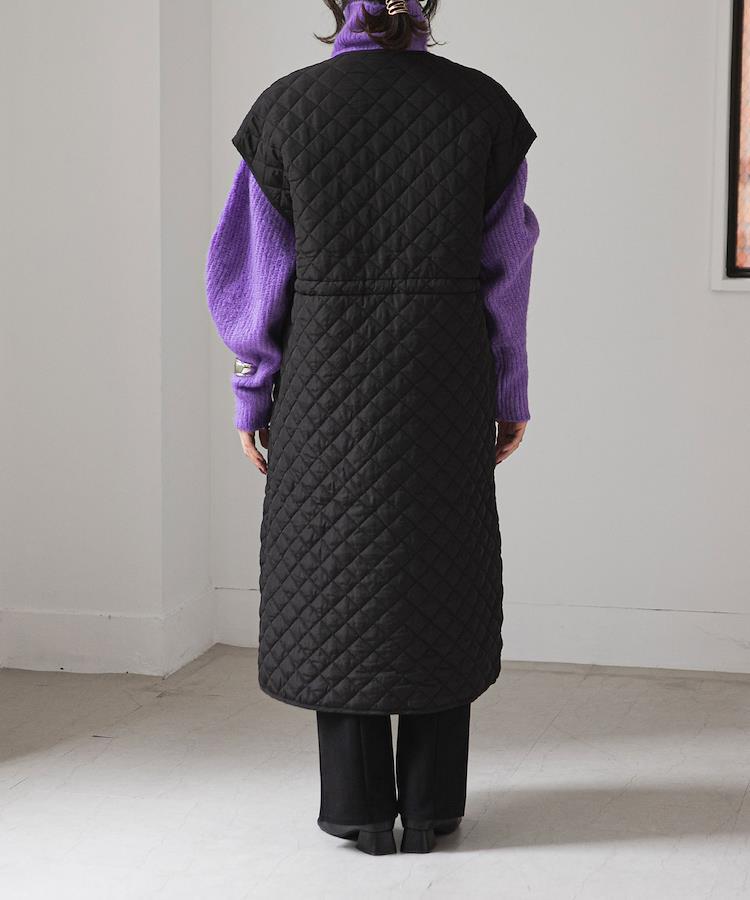 ドロスト仕様でシルエットを変えられるキルティングロングベスト【ディティール】シンプルで取り入れやすいキルティングデザインのロングベスト。中綿入りの程よい肉感で保温性もあり実用性高いアイテムです。ウエスト内側のドロストを絞ることでギャザー分量が調節可能ので、Iラインからフレアーラインまでアレンジ自在!ロング丈ながらもすっきりと着こなせるため、様々なボトムスにバランス良く合わせられます。アームホールを大きめに設定しているので、ボリュームニットももたつかず着用頂けます。すっきりとしたノーカラーデザインでタートルニットやバラクラバとの相性も抜群。アウターとのレイヤードコーディネートも今年らしくておススメです。**********************透け感:なし裏地:あり伸縮性:なし光沢感:なし生地の厚さ:普通**********************《生産国》中国