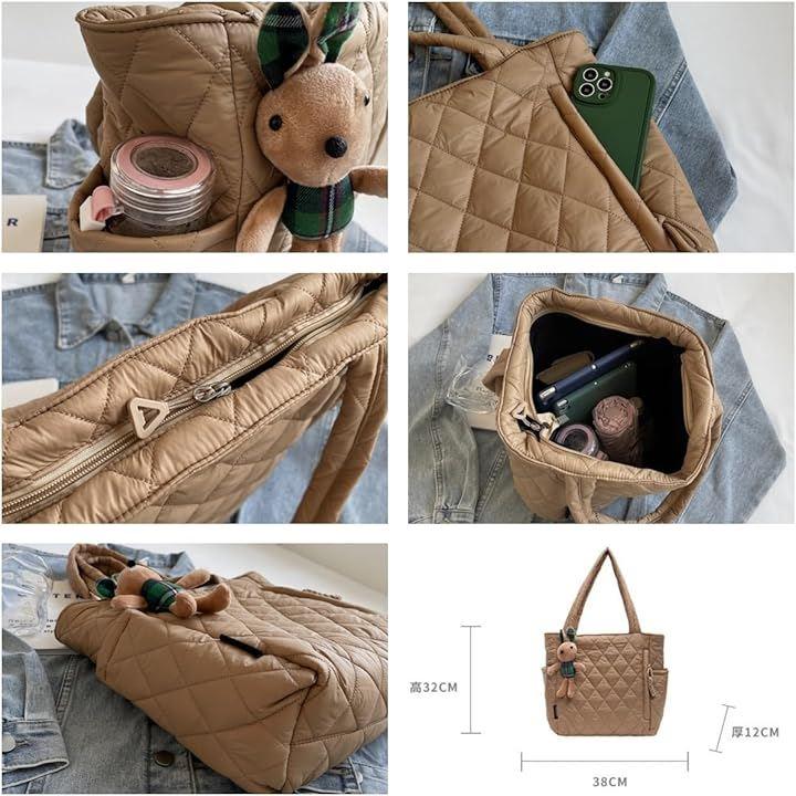「サイズ」縦32cm x 横38cm x マチ12cm、持ち手30cm、内ポケットx、A4や16インチパソコンが入るサイズ、重量270g、バッグ本体のみの販売になります(チャームやアクセサリーは付属しません)