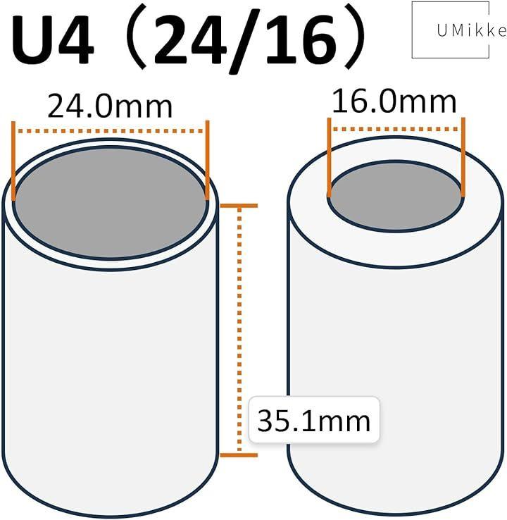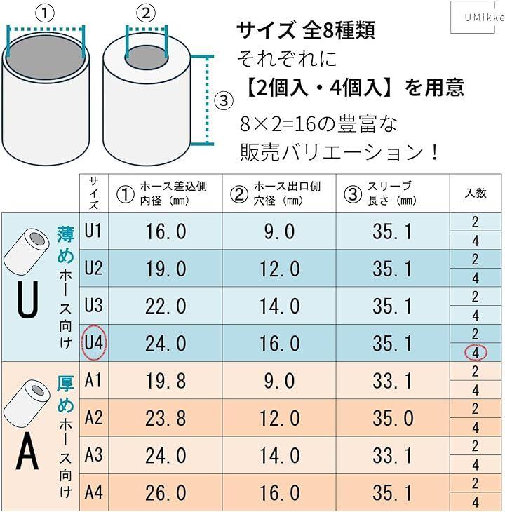 商品名称に含まれる[24.0/16.0/35.1]は、「ホース差込側の穴の内径/ホース出先穴側の穴径/長さ(=適合サイズ) 単位:mm」を表しています。