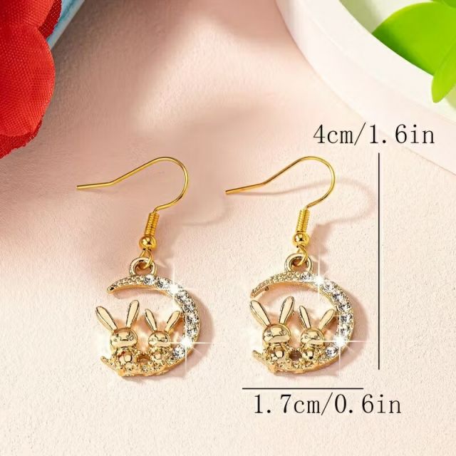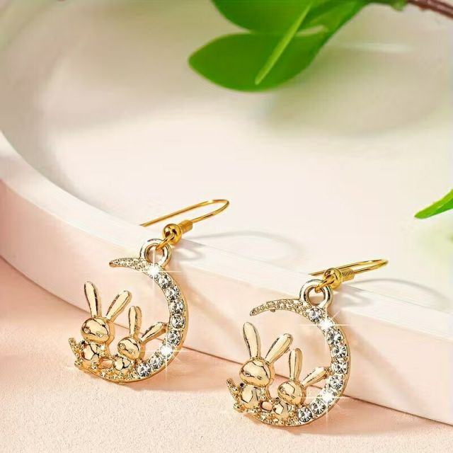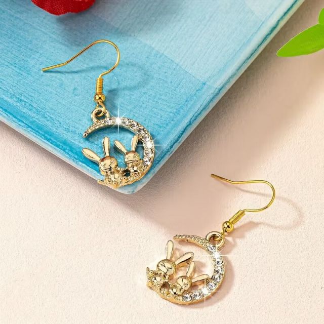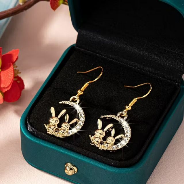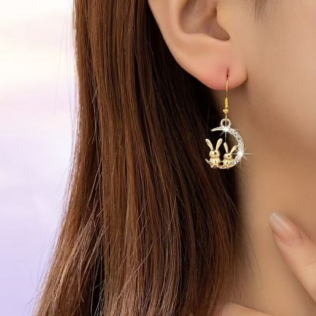 三日月に腰掛けた2匹のウサギのフックピアスです。