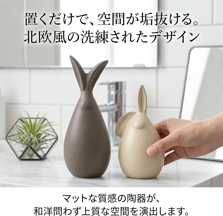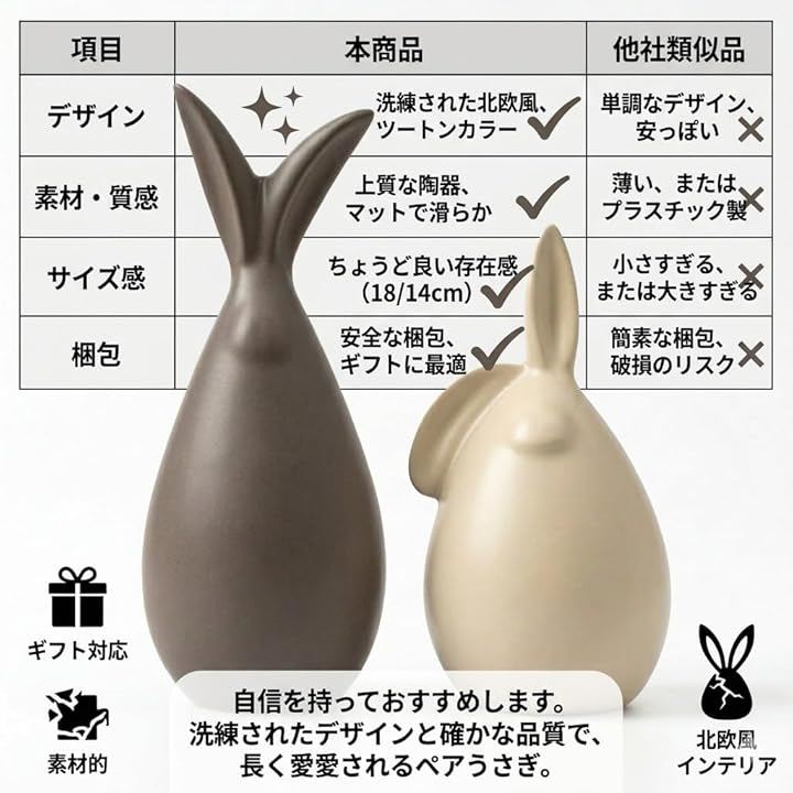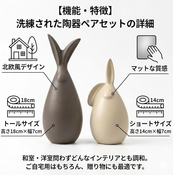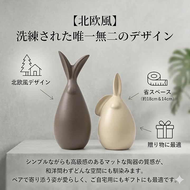 「北欧風の洗練されたデザイン」シンプルでありながらモダンなデザインが特徴のうさぎの陶器オブジェ2個セットです。