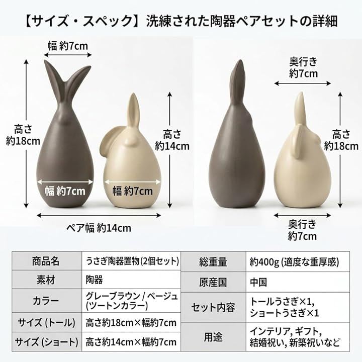 「どこにでも飾れるコンパクトサイズ」背の高いウサギ(高さ18cmx幅7cm)と、背の低いウサギ(高さ14cmx幅7cm)の寄り添うペアセット。