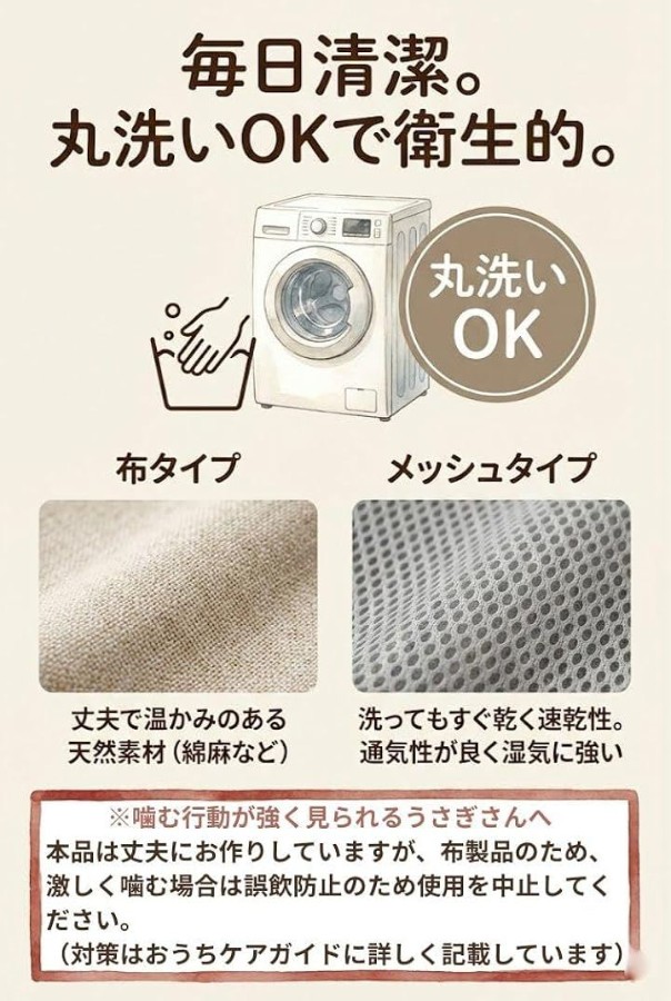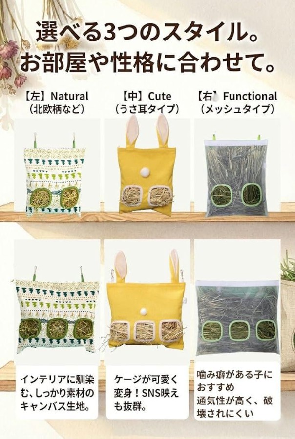 北欧風デザイン、うさ耳タイプ、メッシュタイプの3つのスタイルから、お部屋やうさぎの性格に合わせて選べます。