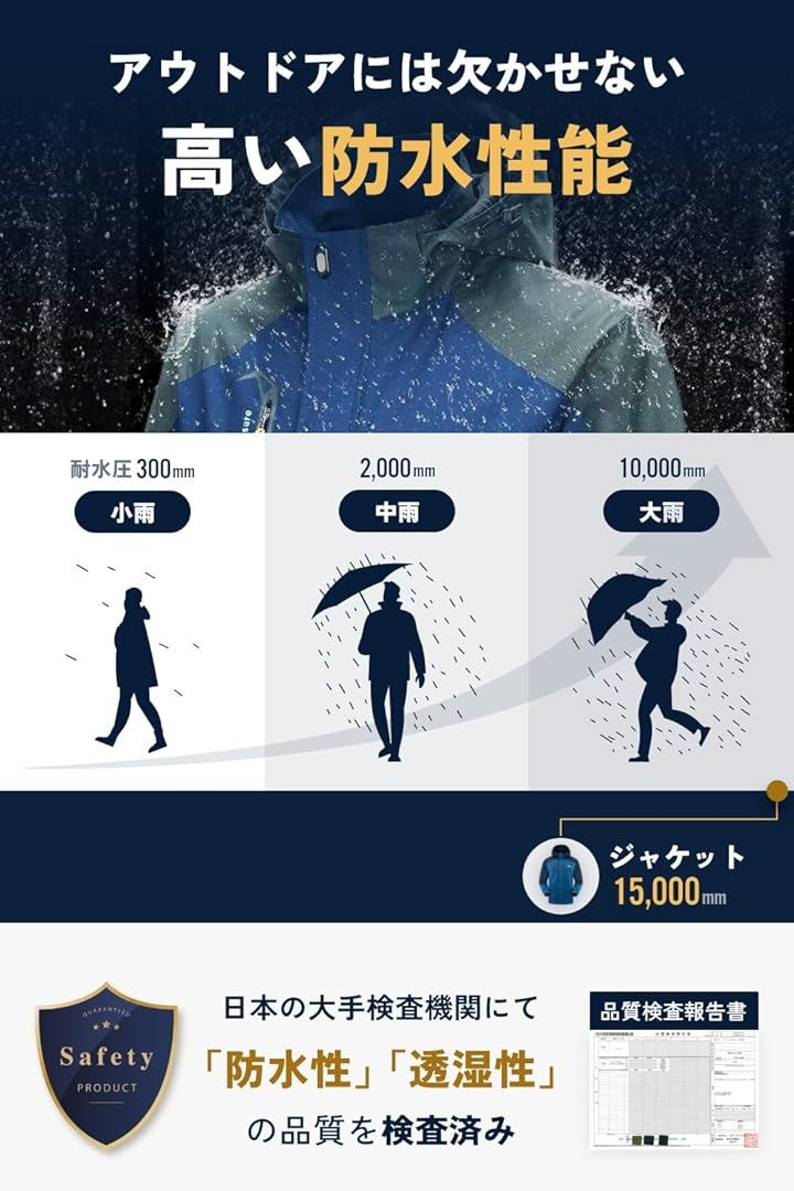 「利用シーン」登山、釣り、バイク、アウトドア、キャンプ、サイクリング、スポーツ、防災など 「機能」*ジャケット:撥水加工(耐水圧15,000mm)、防風、防寒 「カラー」ネイビー、ブラック、ブラウン、グリーン、レッド 「重量」ジャケット約520g 「メイン素材」ポリエステル 「サイズ」M~3XL 着丈 /肩幅/胸囲 /袖丈 [M] : 72 / 48 / 116 / 62 [L] : 74 / 50 / 120 / 64 [XL] :76 / 51.5 / 124 / 66 [2XL] :78 / 53 / 128 / 68 [3XL] :80 / 54.5 / 132 / 70