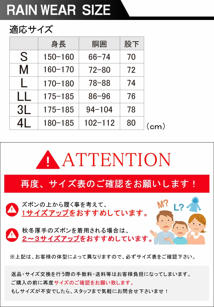 ■サイズ適応S(身長:150-160/胴囲:66-74/股下:70)M(身長:160-170/胴囲:72-80/股下:72)L(身長:170-180/胴囲:78-88/股下:74)LL(身長:175-185/胴囲:86-96/股下:76)3L(身長:175-185/胴囲:94-104/股下:78)4L(身長:180-185/胴囲:102-112/股下:80)