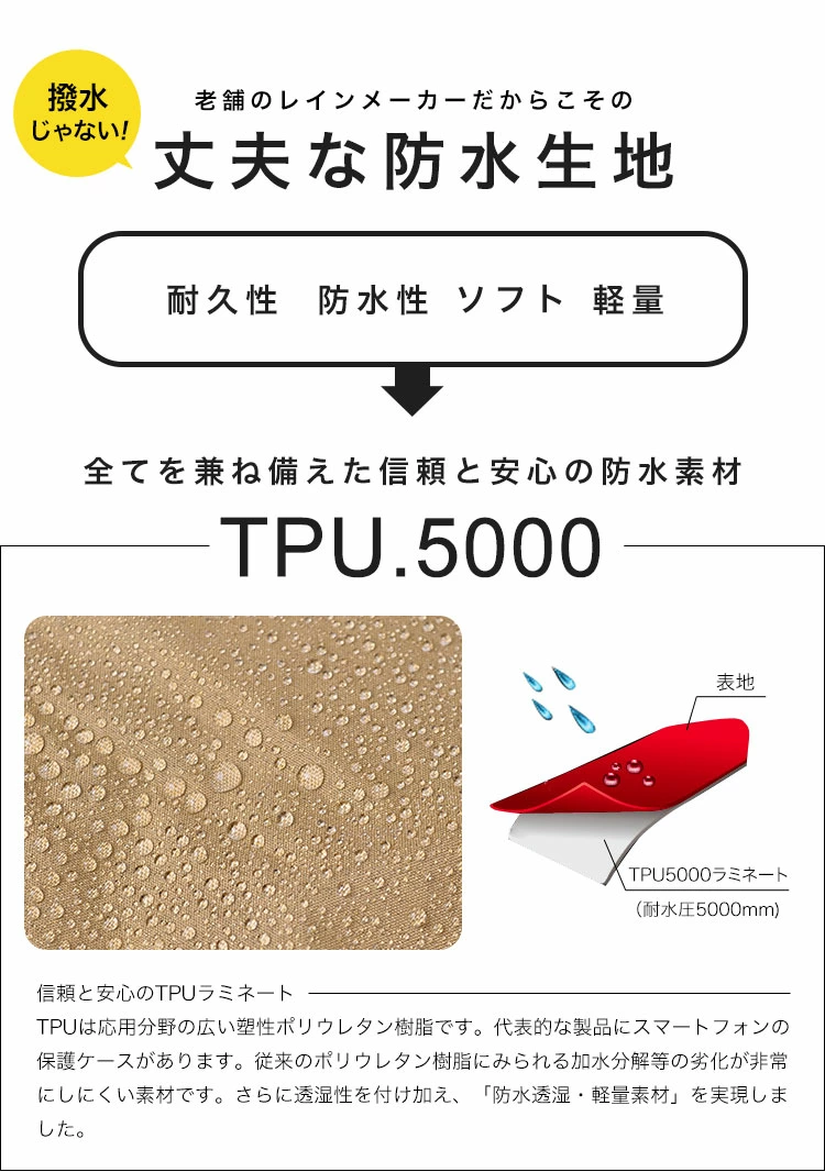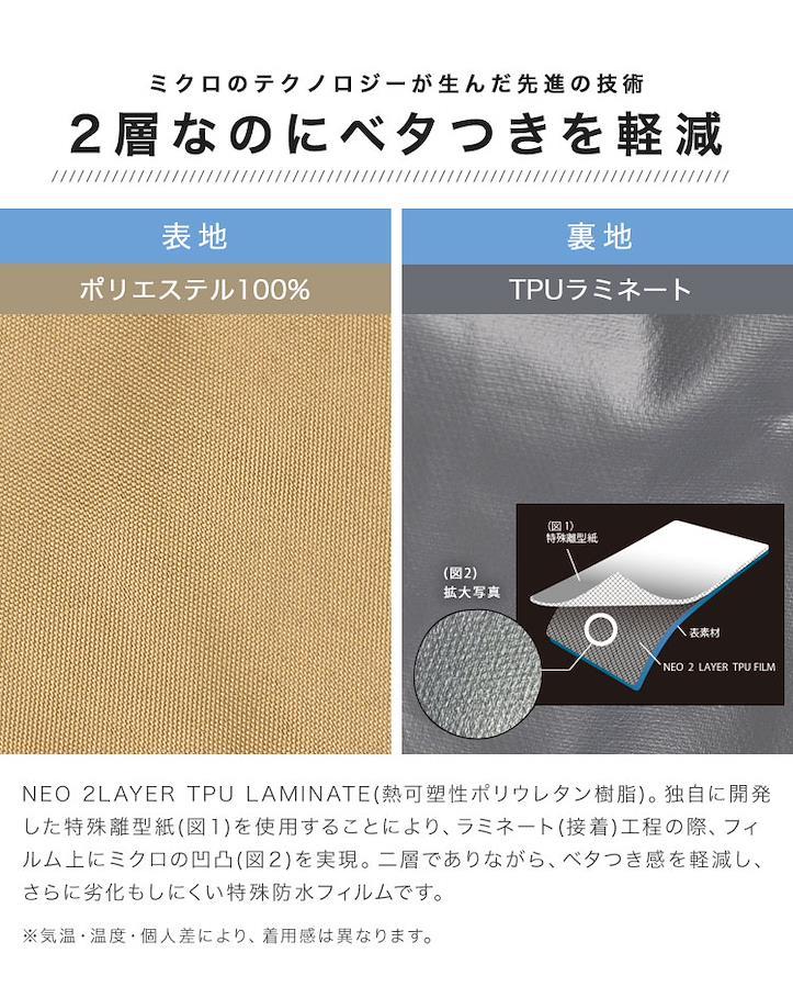 ■ご注意※表記サイズより、多少の誤差があることがございます。※商品の画像はできる限り実物に近づけるよう配慮しておりますが、お使いのモニターやご覧になる環境によりましてはカラーの見え方に差が出る場合がございます。ご了承くださいませ。※TPUラミネートは素材の性質として強い摩擦を受けると防水面が破れたり、剥離する恐れがありますのでご注意ください。※はっ水加工は永久的なものではなく、繰り返しの着用や、汚れの付着などにより効果は低下します。はっ水が弱くなりましたら弱い手洗いで汚れを落とし、市販のはっ水スプレーをご使用ください。