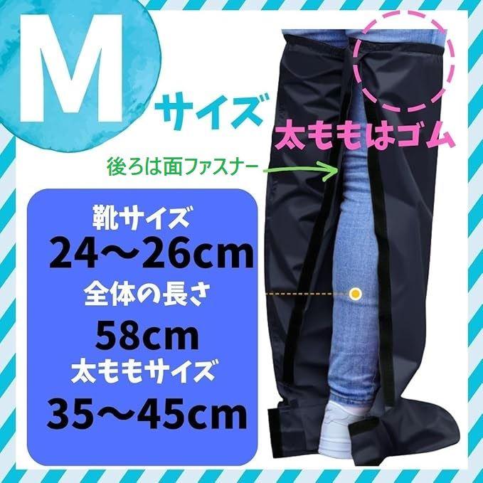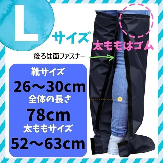 Lサイズ(男性向き):靴サイズ26~30cm 全体の長さ78cm 太ももサイズ52~63cm 靴の上から着ることができ、膝上までの長さあり ロングレインブーツとしても使用できる 靴裏全体を覆わないのですべりにくい