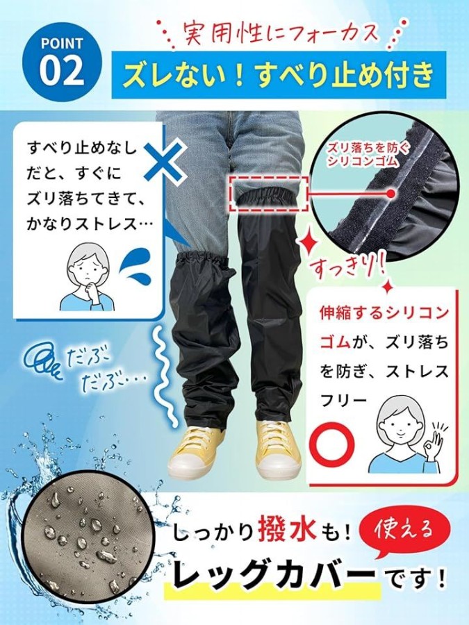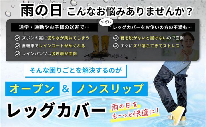 「雨の日を快適に。」通勤・通学・お子様の送迎などにオススメ。お客様の声を元に1から企画開発したレッグカバーです。
