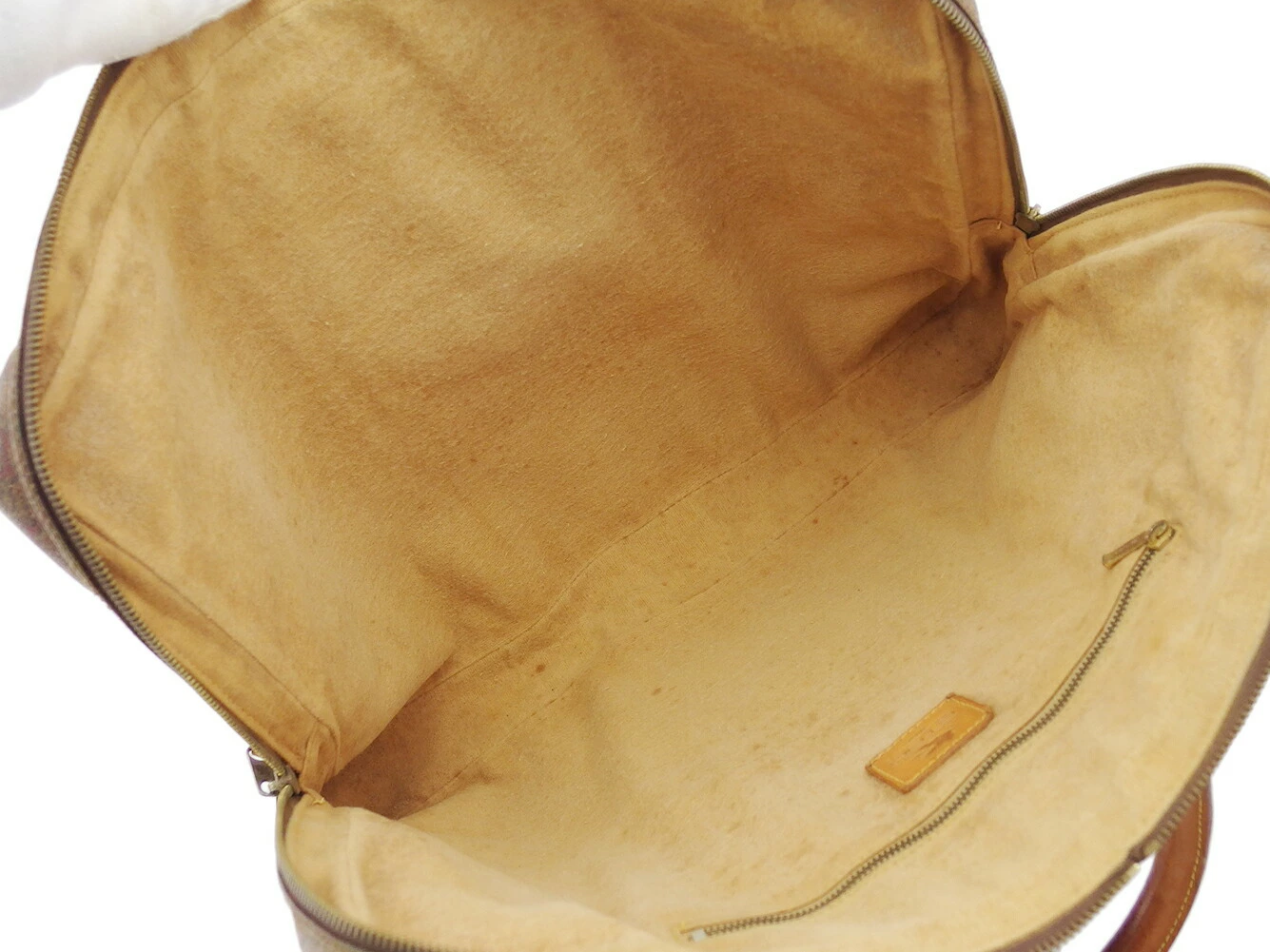 | コンディション | 全体の状態詳細:外観に大きなダメージは無く、ご使用可能です。 外側:パイピング&装飾レザー(表面右角レザーに小さめの濃いシミ汚れ、角スレ&黒ずみ、傷、汚れ)、持ち手(金具付近のレザー削れ、スレ、傷、汚れ)あり。 内側:内張生地(汚れ、毛羽立ち、劣化による粉っぽさ)あり。 その他、目立たない 傷 汚れ などの一般的使用感があります。 |