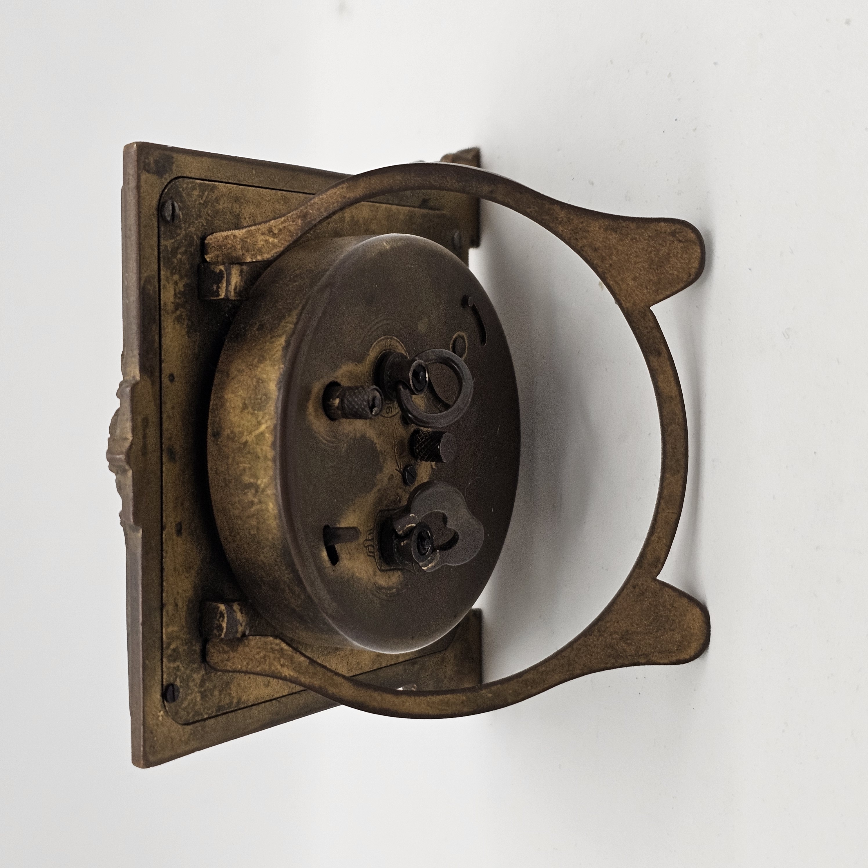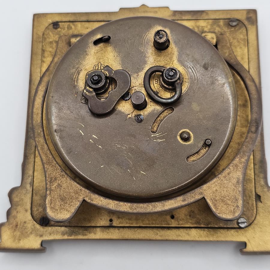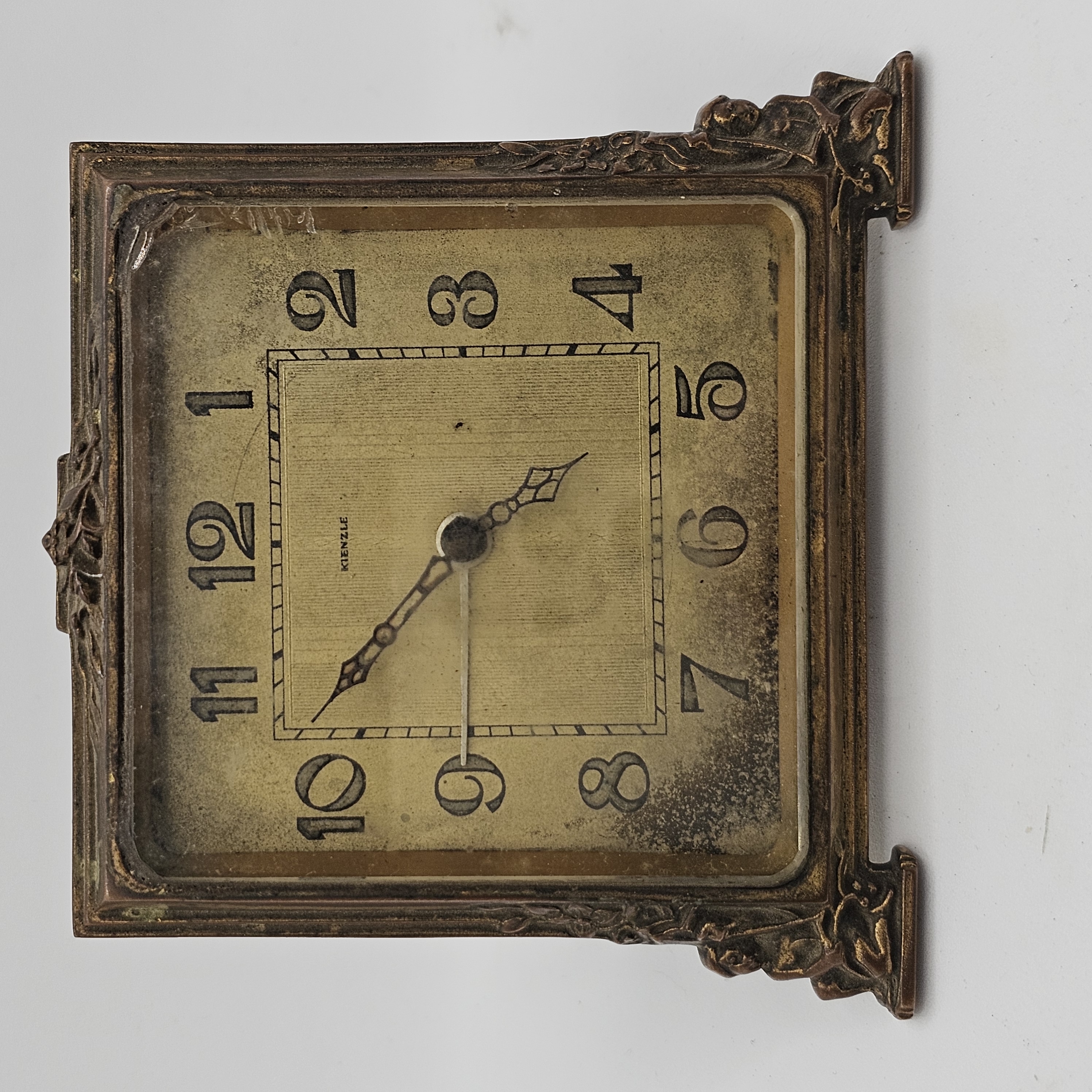 1900年代前半〜中期頃のドイツの老舗時計メーカー、KIENZLE(キンツレ)のアンティークな手巻き式置き時計です。重厚な真鍮(ブラス)フレームに、アールデコ調の洗練された装飾が施された、存在感のある逸品です。