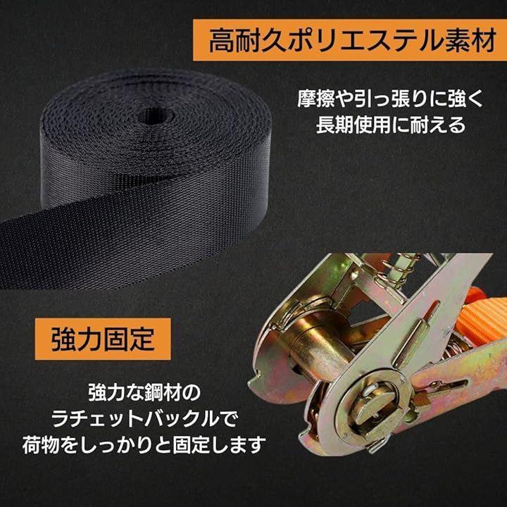 「高耐久・強力固定」このラチェット式荷締めベルトは、摩擦や引っ張りに強いポリエステル素材を採用。