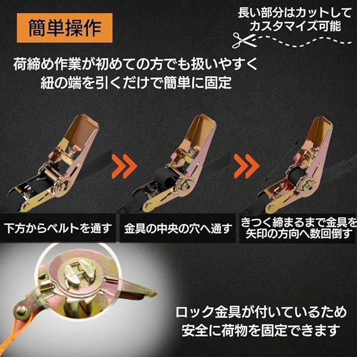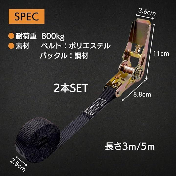 「商品仕様」セット内容:2個入り 長さ:3m / 5m 幅: 2.5cm 耐荷重:800kg 素材:(ベルト)ポリエステル (ラチェットバックル)鋼材