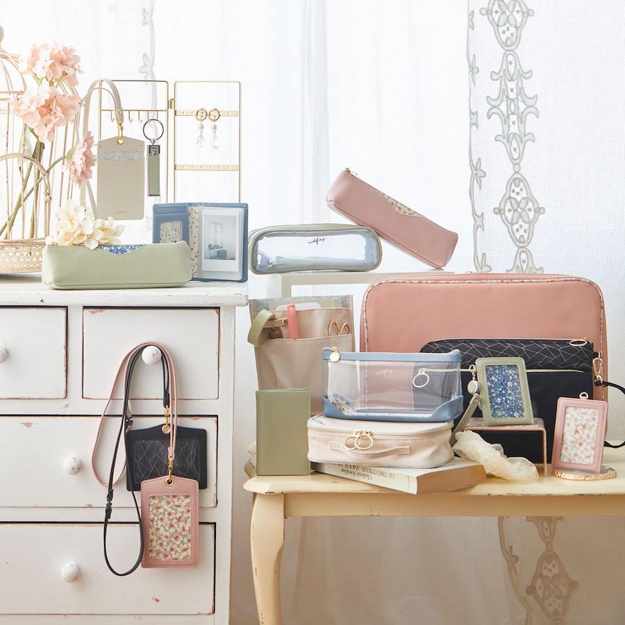 爽やかなクリア素材と落ち着いたカラーの合皮素材、かわいい花柄や幾何学模様のポリエステル生地の組み合わせが上品な女性を演出。