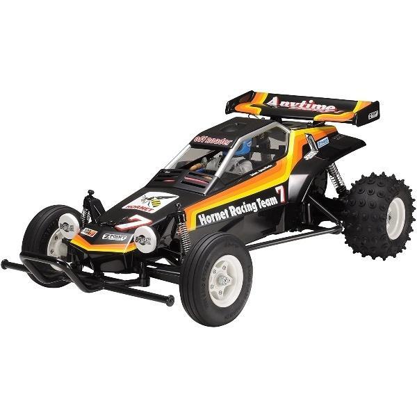 タミヤ 58336 1/10 電動RCカーシリーズ No.336 ホーネット オフロード 1984年にデビューして2WDオフロードカーのブームを生み出したRCホーネット。軽快なフットワークを生かしてオンロードからオフロードまで走る場所を選ばない電動ラジオコントロールバギーの組み立てキット。全長400mm、全高150mm、全幅230mm、車体重量874g。バスタブタイプフレームをはじめサスペンションアームやギヤボックスなどにエンジニアリングプラスチックを多用して、軽量で強度の高い車体構成を実現。サスペンションは、フロントがコイルスプリングによるスイングアクスル独立式、リヤがショック吸収性の高いオイルダンパーユニット装備のローリングリジッドアクスル。オフロード走行につきものの砂や小石の侵入をシャットアウトする密閉式ギヤボックスを装備。スムースなコーナリングを生むデフギヤも内蔵しました。ホイールは前後とも実感あふれる組み立て式の3ピースタイプ。前輪は方向性に優れたグルーブドタイヤ、後輪はハイグリップなスパイクタイヤを装着。ボディは軽くショックに強いポリカーボネート製。送信機、スピードコントローラー、受信機、サーボ、7.2Vバッテリーは別売りです。